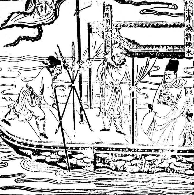 When Zhu became emperor, determined that China must be a great maritime power, he ordered a frenetic shipbuilding campaign that launched huge fleets carrying up to 30,000 personnel. They transported both a wide range of Chinese goods and the most advanced ordnance of the day—guns, cannonballs, and rockets. The biggest boats were treasure ships that were as much as 10 times larger in capacity than those Christopher Columbus would captain to the New World almost a century later. These Chinese voyages would take two or three years, with eunuchs in command of each of the fleets. But the commander in chief, above all others, was Zheng. He eventually became known as the Three-Jewel Eunuch, in honor of the “three jewels” central to the dominant Buddhist faith of Zhu’s reign.